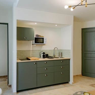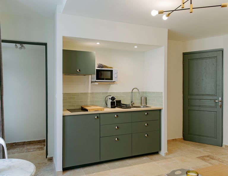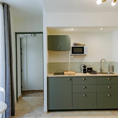 Il est pensé comme un loft avec sa cuisine ouverte et équipée, son salon, son lit double et sa salle d'eau avec douche à l'italienne et toilettes.
